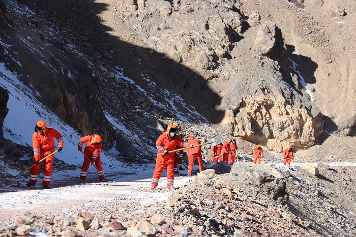 中午時分,養路職工們拿出備好的干糧,白餅、榨菜、水果等,找一處相對平緩的山坡團坐在一起,快快填飽肚子。盡管艷陽高照,晴空萬里,但山里的溫度卻達到了零下26度!再加上山里寒烈的大風,棉衣也會被凍透,這種寒冷簡直是“凍徹心扉”!在這里勞作、吃飯都是對體力和毅力極大的考驗!