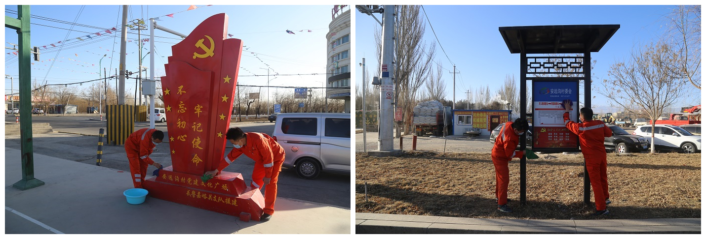 走進鄉村開展公益活動,志愿者們來到安遠溝村委會文化廣場,充分發揚不怕苦不怕累的精神,對公益設施、健身器材、國道公交站牌等公共設施等進行了擦拭清洗,通過一番勞作,廣場設施煥然一新。