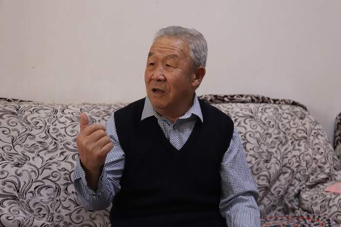 那時候修筑703公路的工作是真得苦,有一次在我裝石頭拉石頭的時候,有一塊大石頭掉下來,當時就把大拇手指頭砸爛了,血透過斷裂的指甲蓋就往出來流,我(忍著痛)眼睛一閉,直接就(把砸斷的指甲蓋)揪下來扔掉了,然后去大夫跟前上了一點藥,繼續跟上干。那個時候工作忙得很,每天很早就去上班,晚上天黑再回來。(說到此處,老人倒顯得平靜,但在場眾人不禁感嘆,這是怎樣的錚錚鐵骨、硬氣男兒!)