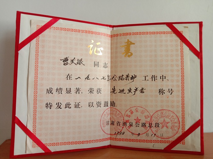 有一次兒子正在考警校,我跟段長申請休息幾天去照看兒子備考,段長說現在的事情不是一個電話的事情,你還是待下吧,最終我還是選擇留下來干工作。那時領導也信得過我,哪里的活不行就把我派去哪里,我也能保質保量給干好。在工程上我干了11年,夏天就一直沒回過家,哪里有工程人就在哪里,蘭州就跑了好幾年,山丹、景泰也都去過。后來我已經退休了,領導說工程上的路不行,驗收不上,就又找到了我,11公里的路從頭到尾我都和他們一起又過了一遍。當時我在旅社住,東西背不上去,就人拉。機件上不去沒辦法干,后來2個機子上去了,油桶拉上去,10天日子,24小時不休息,最后我們成了第一名。后來檢查彎道也有了,寬度也夠了,監理公司的人說“你們這才像個干家!”