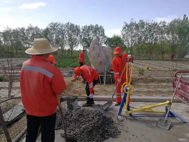 根據(jù)維修方案,提前準(zhǔn)備好相關(guān)工具和材料,施工現(xiàn)場,職工們分工協(xié)作、有條不紊,有的拉運材料、有的豎桿、有的運送,有的攪拌,個個爭先恐后,干勁十足。在大家的共同努力下,澆筑起了60厘米高的水泥混凝土底座,對存在較大安全隱患的景觀石進(jìn)行加固,進(jìn)一步保障了職工生產(chǎn)生活安全。