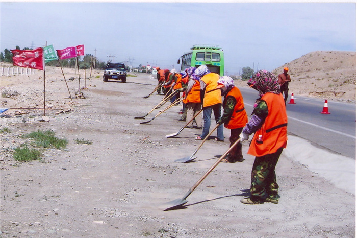 ? ? 在日常工作中,清邊溝、整理路容的要求非常高,內側要求三條線,邊溝一條線,路沿一條線,底溝一條線,三條線是整整齊齊、有棱有角。當時的工作要求是邊溝的外延線5米內不允許有任何雜物存在,基本上戈壁灘上的雜草都是她們用鐵鍬、洋鎬一鍬一鍬、一鎬一鎬挖掉的,過往的司機甚至覺著外沿線比公路還要干凈,成了嘉峪關公路上一道亮麗的風景線。