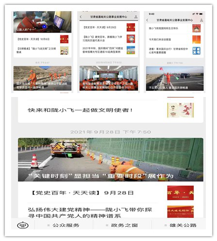 嘉峪關(guān)公路事業(yè)發(fā)展中心為扎實推動黨史學(xué)習(xí)教育走深走實,引導(dǎo)中心全體干部職工知史愛黨、知史愛國,開展了“弘揚偉大建黨精神-隴小飛帶你探尋中國共產(chǎn)黨人的精神譜系”學(xué)習(xí)活動,傳承紅色基因,賡續(xù)共產(chǎn)黨人的精神血脈。截止目前,組織中心全體干部職工學(xué)習(xí)了“弘揚偉大建黨精神-隴小飛帶你探尋中國共產(chǎn)黨人的精神譜系”,在微信公眾號推送15期“隴小飛”相關(guān)內(nèi)容,在辦公樓LED電子顯示屏不間斷滾動播放“隴小飛”視頻和圖片,中心全體干部職工179人下載了“隴小飛”表情包并使用。