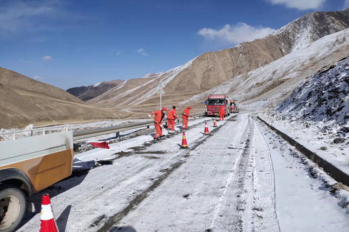 嘉峪關公路事業發展中心鏡鐵公路段管養的S215線是酒鋼集團鏡鐵山礦區生活物資運輸和連接青海的重要通道。10月27日,受較強冷空氣影響,鏡鐵山迎來2021年冬季首場降雪,鏡鐵公路段緊急集結人員在降雪路段撒布防滑料和融雪劑。28日夜間又有零星降雪,山區路段氣溫低至-15℃,出現冰雪凝凍現象,導致為鏡鐵山礦補給生活物資及生產用品的車輛被困吊大坂路段。