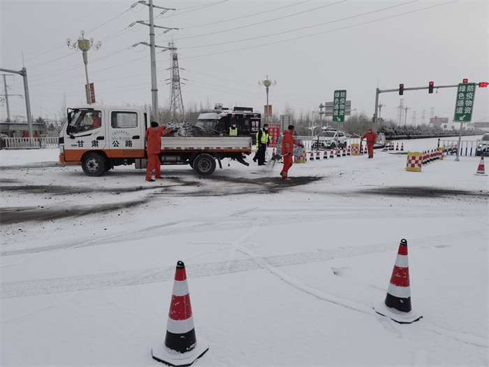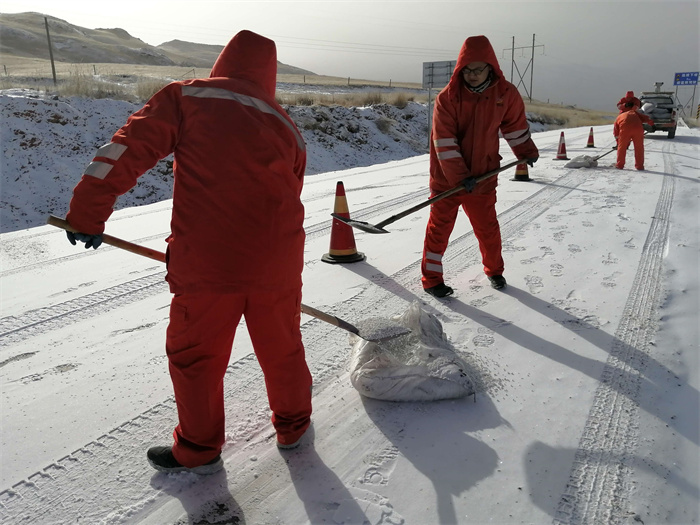 雄關(guān)公路段集合應(yīng)急保暢隊(duì)伍,G312線、X302線、X304線、X257、X259線急彎陡坡、橋梁以及結(jié)冰路段,利用“機(jī)械”+“人工”的方式快速撒布防滑料、融雪劑,積極消除降雪天氣對(duì)道路交通帶來(lái)的不利影響,保障過(guò)往車(chē)輛行人通行安全。