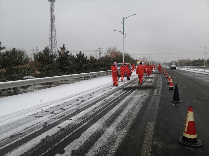 截止14時30分,中心共出動應急保暢人員51人,融雪劑撒布機2臺、皮卡車10輛、多功能除雪車1輛,撒布融雪劑12噸、防滑料20方。