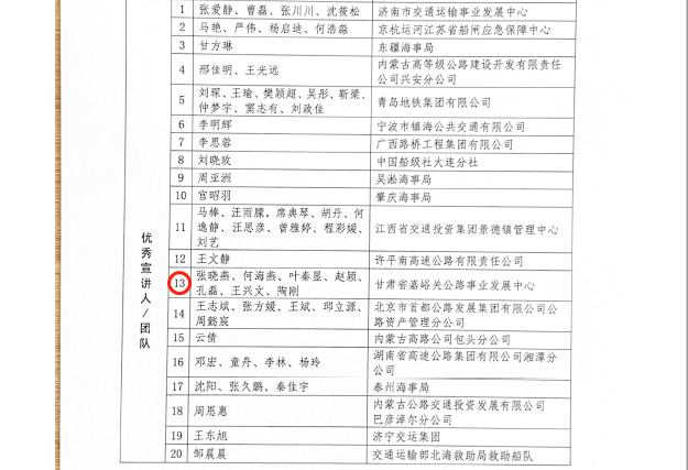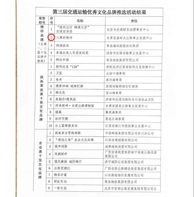 11月23日,由中國交通報社和中國交通報刊協會舉辦的“講出你的品牌故事”第三屆交通運輸優秀文化品牌展示活動結果出爐(中交報字〔2021〕86號),甘肅交通“八棵樹精神”喜獲“榜樣品牌”、“十佳文創產品”、“優秀宣講人/團隊”等3項榮譽。