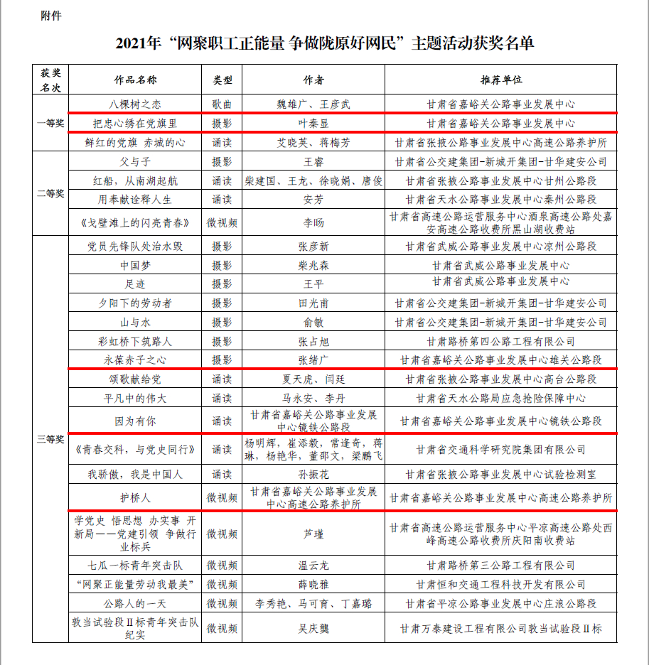 近日,由甘肅省總工會聯合甘肅省委網信辦舉辦的甘肅省2021年“網聚職工正能量,爭做隴原好網名”主題活動甘肅交通運輸行業獲獎單位和個人名單揭曉,我中心選送的歌曲《八棵樹之戀》、攝影作品《把忠心繡在黨旗里》榮膺一等獎,鏡鐵公路段朗讀作品《因為有你》、高速公路養護所微視頻《護橋人》、雄關公路段職工張緒廣攝影作品《永葆赤子之心》榮膺三等獎。
