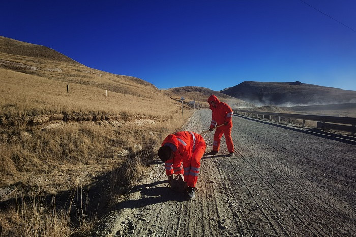 大年初三的早晨,太陽剛剛露出鏡鐵山頭,鏡鐵山養管站職工武玉斌和陶剛就已經換上標志服,檢查好車輛,完成了班前交底,迎著朝陽開始了一整天的工作,他們對管養的S215線的路面拋灑物進行了清理,提前在急彎陡坡路段儲備防滑砂融雪劑,為人民群眾安全出行提供有力保障。