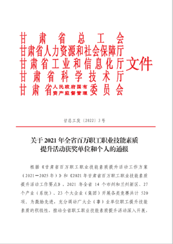 日前,從甘肅省總工會《關于2021年全省百萬職工職業技能素質提升活動獲獎單位和個人的通報》文件獲悉,我中心9名職工被甘肅省總工會授予“甘肅省技術標兵”榮譽稱號。