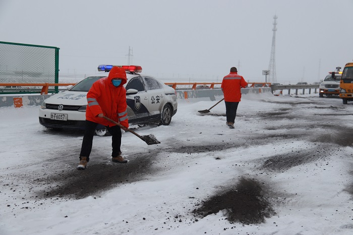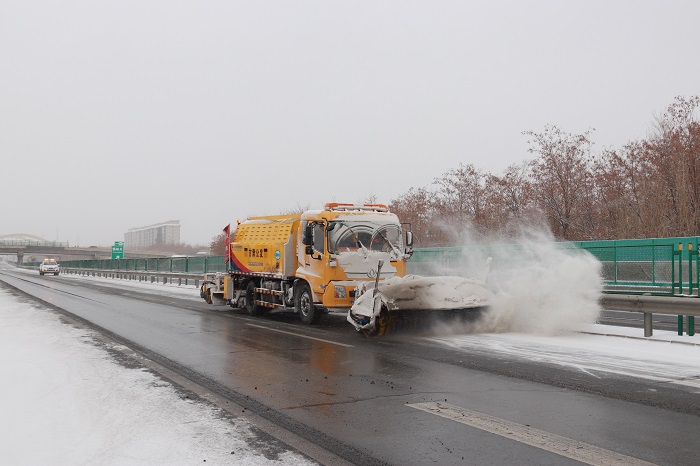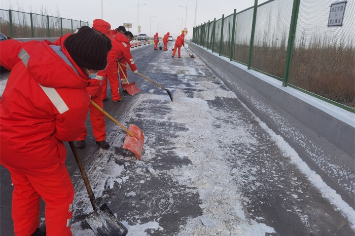 大型除雪車、融雪鹽撒布機呼嘯著來回作業,除雪人員身穿橘黃標志服,手拿除雪工具,除冰的,撒鹽的,鏟雪的,叮叮咣咣,臉凍紅了,手凍腫了,鞋襪濕透了,直到凌晨一點多鐘,管養高速公路全線車輛通行。大家長吁一口氣,在零下十幾度的夜晚,應急人員們卻忙出了一身汗。