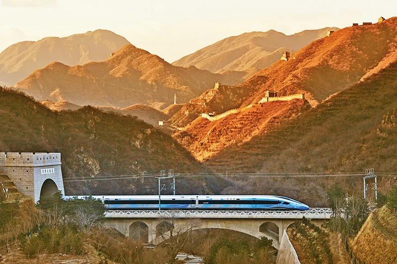 高鐵是交通運輸現代化的重要標志,也是一個國家工業化水平的重要體現。1909年,京張鐵路建成;2019年,京張高鐵通車。從自主設計修建零的突破到世界最先進水平,從時速35公里到350公里,京張線見證了中國鐵路的發展,也見證了中國綜合國力的飛躍。作為我國首條建成投用的智能高鐵,京張高鐵也是北京冬奧會的重要配套工程。圖為2022年1月10日,北京冬奧列車在京張高鐵居庸關長城附近運行。 羅春曉/攝