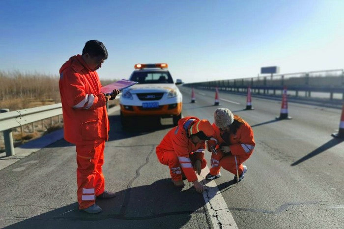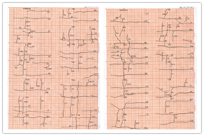 詳細(xì)的路況調(diào)查是做好繪制“藍(lán)圖”、編制方案的基礎(chǔ)。從事公路養(yǎng)護(hù)多年的老技術(shù)人員重新拾起已經(jīng)撂下多年的技藝,給年輕的技術(shù)員現(xiàn)場細(xì)心講解、手把手的教,讓比例尺、米格紙在年輕人的腦海中有了印象。采取“以老帶新”的分工方式分工協(xié)作,組織開展調(diào)查路面裂縫密度、裂縫寬度、裂縫間距、裂縫長度的工作,及時總結(jié)橫向裂縫間距6-10m分布規(guī)律,形成縱向十米,橫向以路緣石、行車道標(biāo)線、應(yīng)急車道外緣為界限的布圖框架,以便技術(shù)人員準(zhǔn)確、快速捕捉到每一條裂縫,現(xiàn)場繪制每一條裂縫“藍(lán)圖”。