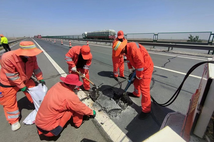 抓進(jìn)度保質(zhì)量,養(yǎng)護(hù)出成績。緊抓夏日晴好天氣,全面推進(jìn)路面灌縫、橋涵維修等養(yǎng)護(hù)工作,累計完成G30連霍高速公路微表處鋪筑35000平方米、油路修補(bǔ)30平方米、網(wǎng)裂修復(fù)貼粘貼150平方米、灌縫1578.3延米,S215線路面灌縫2850.5延米、油路修補(bǔ)12平方米、基層冷再生1750平方米,S301線路面貼縫992.5延米、油路修補(bǔ)144.92平方米。同時,緊盯汛期雨情,全面開展汛期橋涵排查清淤工作,主要對伸縮縫、泄水孔等重點(diǎn)區(qū)域及涵洞進(jìn)出水口等重點(diǎn)部位全面摸排檢查,對發(fā)現(xiàn)的隱患問題及時進(jìn)行整改。