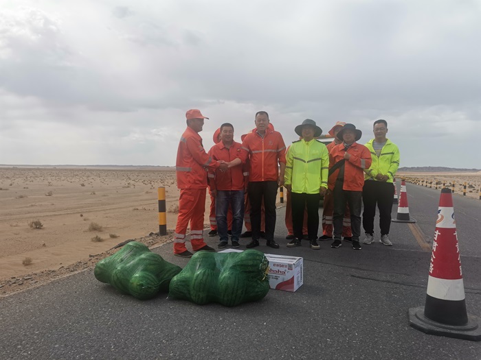 戈壁灘上難尋一處陰涼地,職工們索性路邊圍坐一團,大口吃起西瓜,補充水分,后背大塊大塊的汗跡訴說著一線養護的辛勤和艱苦。閑聊間,養管站站長想起昨天作業結束回去都快八點了,扭頭問向旁邊的小魏,“昨兒孩子接上了嗎”“接上了,接上了,還好咱門有溫馨管家的服務,給我幫了大忙。”“確實,有了這個服務,我干活的時候也放心多了,不用再想著家里的好多事了。”