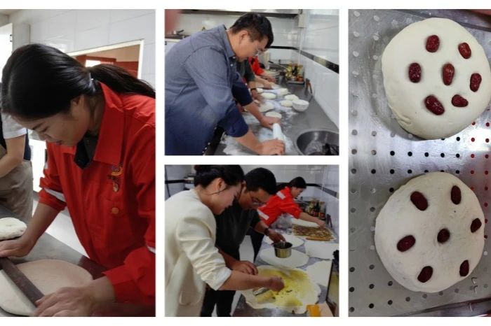 活動的最后,大家齊動手制作老月餅。在職工食堂內,大家搟皮、撒香料、包月餅……分工合作,其樂融融。隨著蒸箱中傳出陣陣誘人的香氣,一個個白白胖胖的月餅躍然“盤”上。