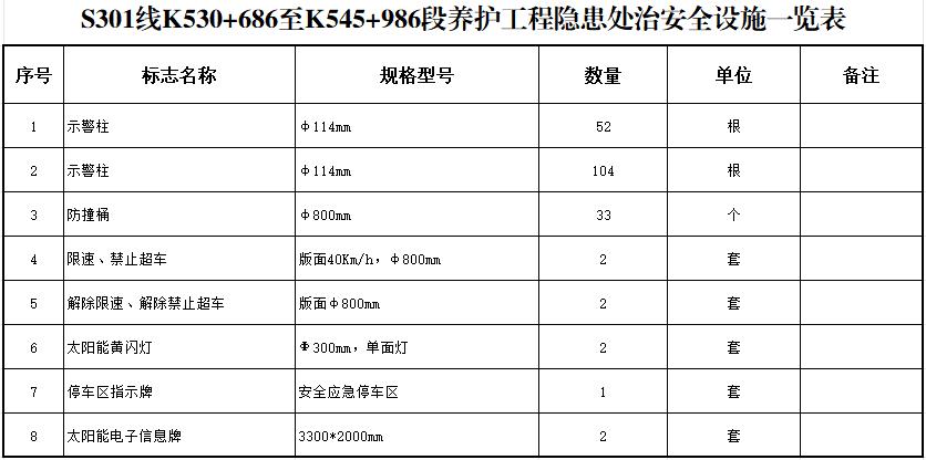 因2024年S301線K530+686至K545+986段養護工程實施路段安全隱患處治需要,擬采購一批交通安全設施,公示如下: