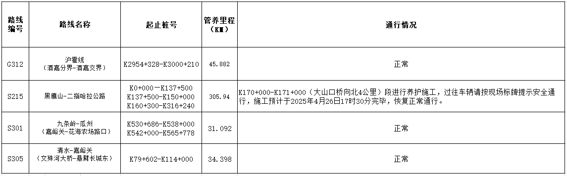 嘉峪關公路事業發展中心管養公路路況信息(2025年4月26日)