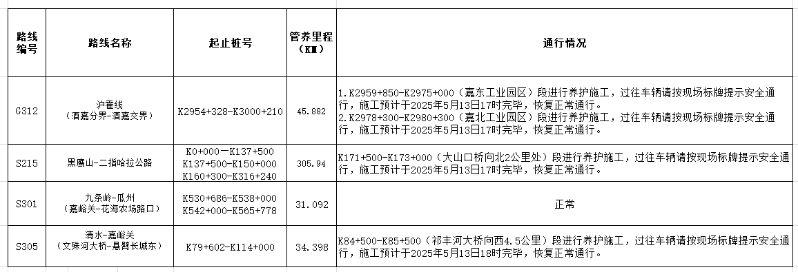 嘉峪關公路事業發展中心管養公路路況信息(2025年5月13日)