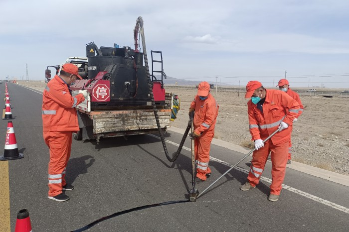 清晨7點(diǎn)30分,養(yǎng)管站站長已帶領(lǐng)工人們開始路面灌縫作業(yè)。作業(yè)現(xiàn)場,工人們嚴(yán)格遵循“開槽準(zhǔn)確、清縫徹底、灌縫飽滿、路面整潔、線條美觀”的技術(shù)標(biāo)準(zhǔn),默契配合,確保每一道工序都精益求精。那一抹抹橘紅色的身影,在春日陽光下格外醒目,成為公路上最亮麗的風(fēng)景線。