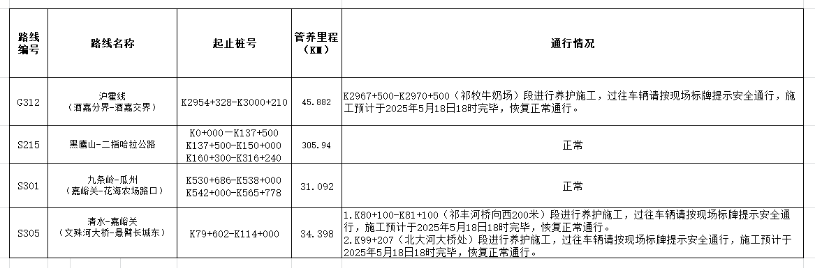 嘉峪關公路事業發展中心管養公路路況信息(2025年5月18日)