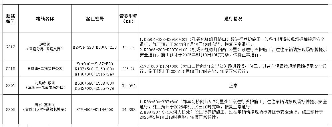 嘉峪關(guān)公路事業(yè)發(fā)展中心管養(yǎng)公路路況信息(2025年5月19日)