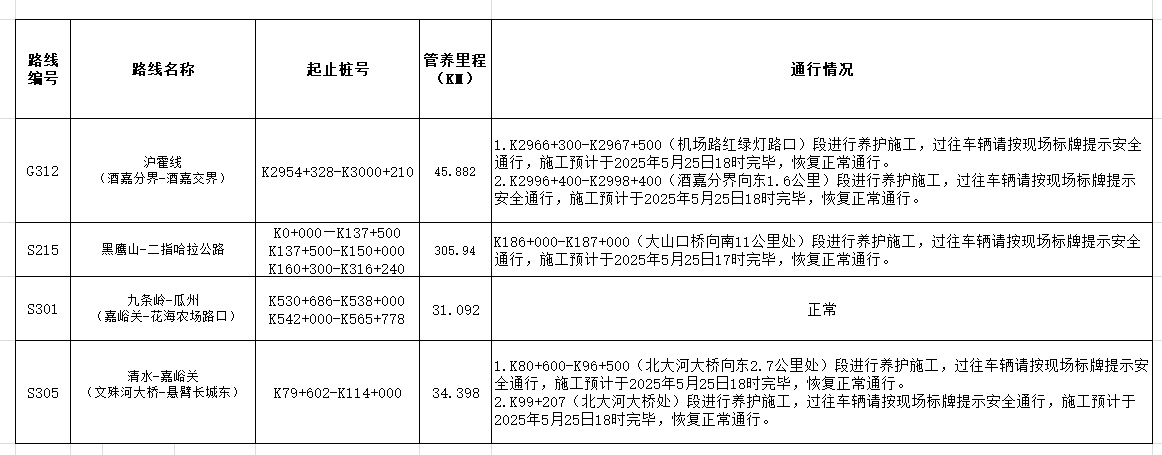 嘉峪關公路事業發展中心管養公路路況信息(2025年5月25日)