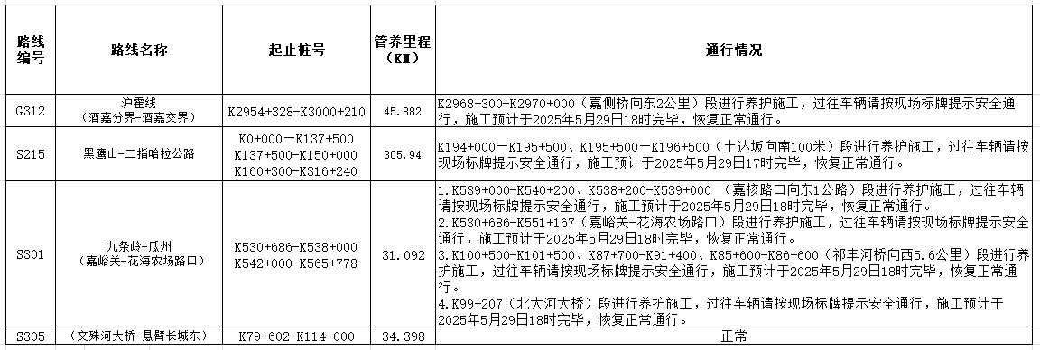 嘉峪關(guān)公路事業(yè)發(fā)展中心管養(yǎng)公路路況信息(2025年5月29日)