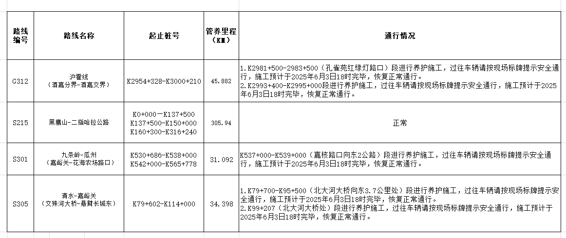 嘉峪關公路事業發展中心管養公路路況信息(2025年6月3日)