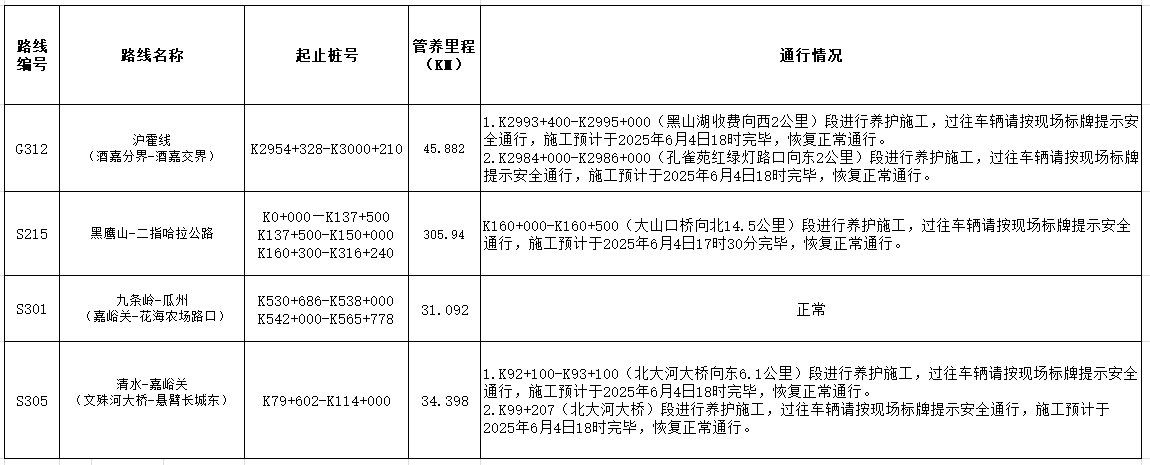 嘉峪關(guān)公路事業(yè)發(fā)展中心管養(yǎng)公路路況信息(2025年6月4日)
