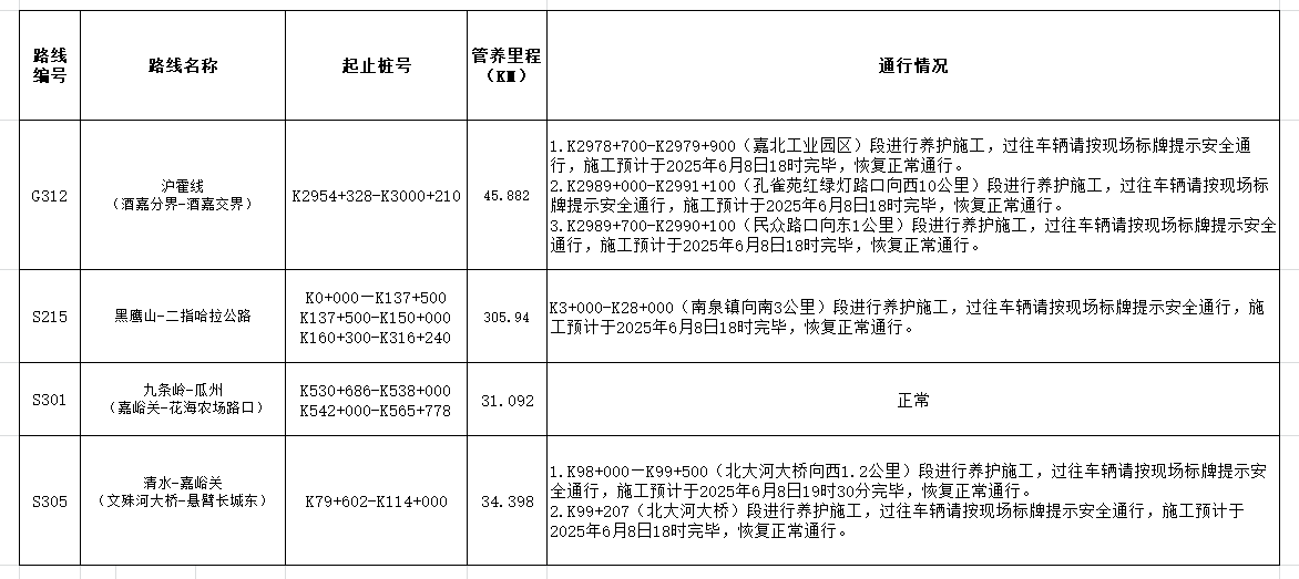 嘉峪關公路事業發展中心管養公路路況信息(2025年6月8日)