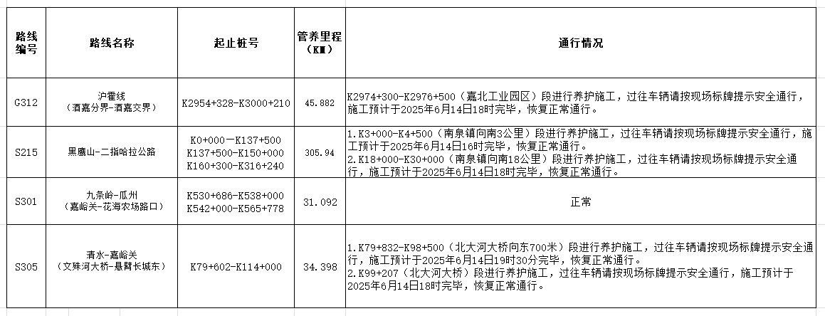 嘉峪關公路事業發展中心管養公路路況信息(2025年6月14日)
