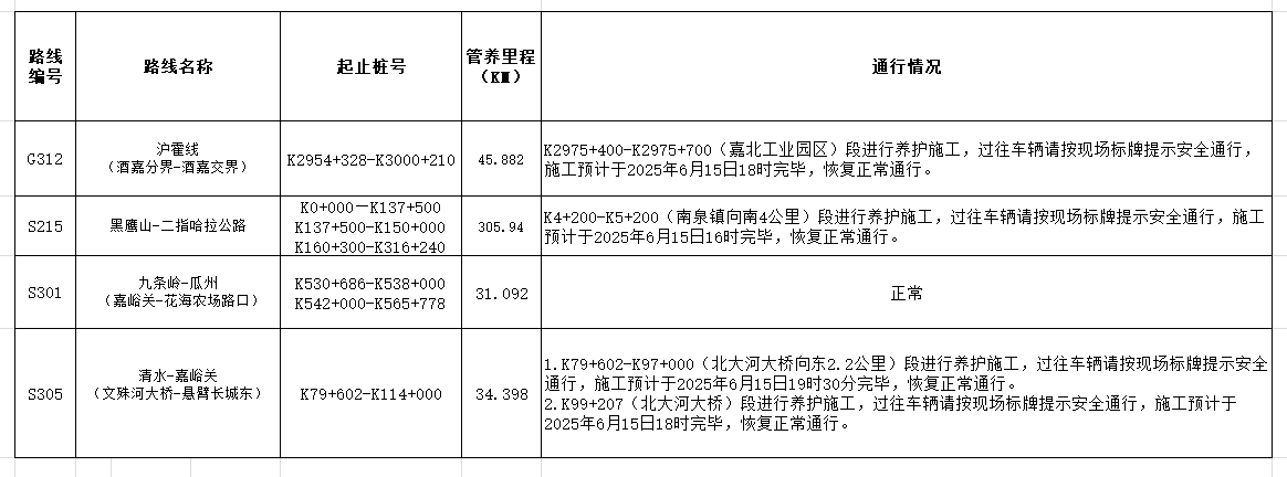 嘉峪關公路事業發展中心管養公路路況信息(2025年6月15日)
