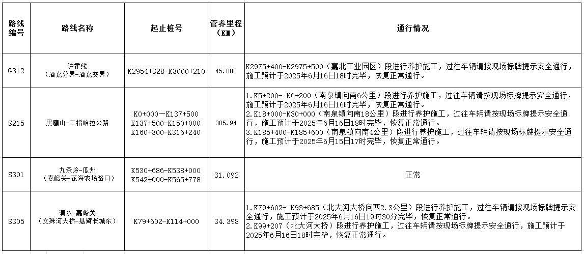 嘉峪關公路事業發展中心管養公路路況信息(2025年6月16日)