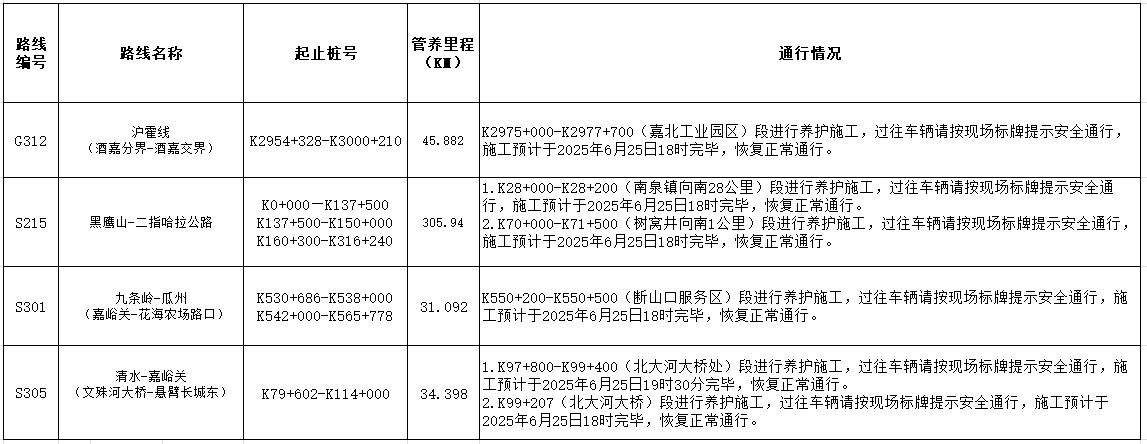 • 嘉峪關公路事業發展中心管養公路路況信息(2025年7月25日)