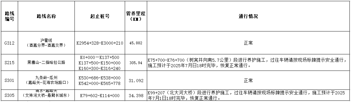 嘉峪關公路事業發展中心管養公路路況信息(2025年7月1日)