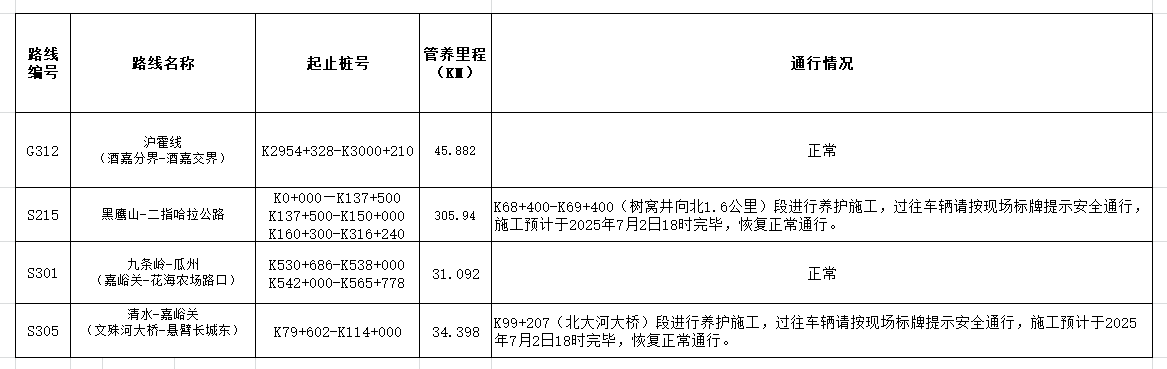 • 嘉峪關公路事業發展中心管養公路路況信息(2025年7月25日)
