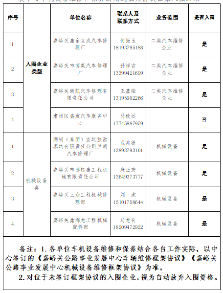 從資格審查、檢修技術(shù)服務(wù)保障、技術(shù)服務(wù)人員、零配件質(zhì)量、工時(shí)費(fèi)用、合同業(yè)績(jī)等方面進(jìn)行了綜合調(diào)研評(píng)審,現(xiàn)對(duì)甘肅省嘉峪關(guān)公路事業(yè)發(fā)展中心車(chē)機(jī)設(shè)備維修和保養(yǎng)封閉式框架協(xié)議征集入圍結(jié)果進(jìn)行公示。