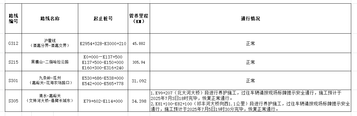 嘉峪關(guān)公路事業(yè)發(fā)展中心管養(yǎng)公路路況信息(2025年7月5日)
