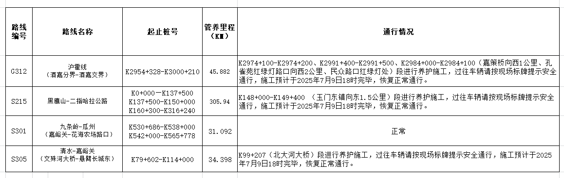 嘉峪關公路事業發展中心管養公路路況信息(2025年7月9日)