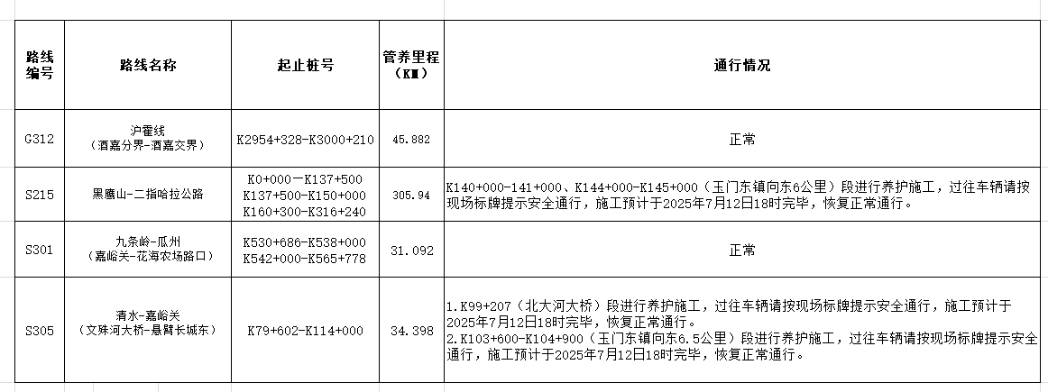 嘉峪關公路事業發展中心管養公路路況信息(2025年7月12日)