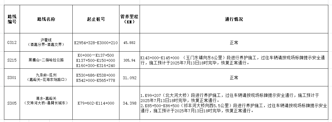 嘉峪關(guān)公路事業(yè)發(fā)展中心管養(yǎng)公路路況信息(2025年7月13日)