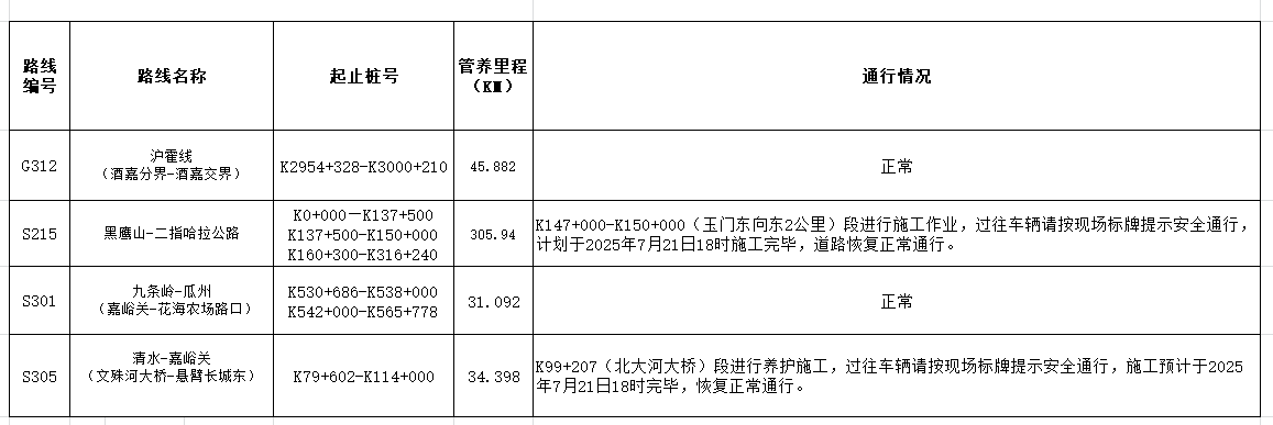 嘉峪關(guān)公路事業(yè)發(fā)展中心管養(yǎng)公路路況信息(2025年7月21日)