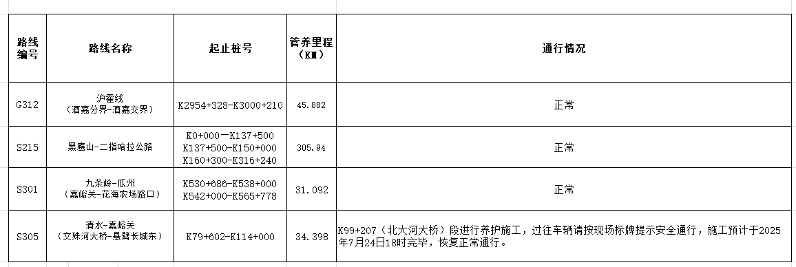 嘉峪關(guān)公路事業(yè)發(fā)展中心管養(yǎng)公路路況信息(2025年7月24日)
