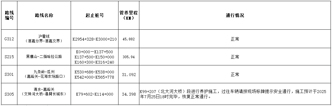 嘉峪關(guān)公路事業(yè)發(fā)展中心管養(yǎng)公路路況信息(2025年7月25日)