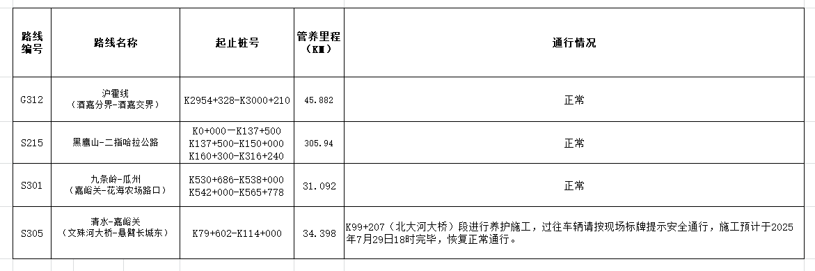 嘉峪關(guān)公路事業(yè)發(fā)展中心管養(yǎng)公路路況信息(2025年7月29日)