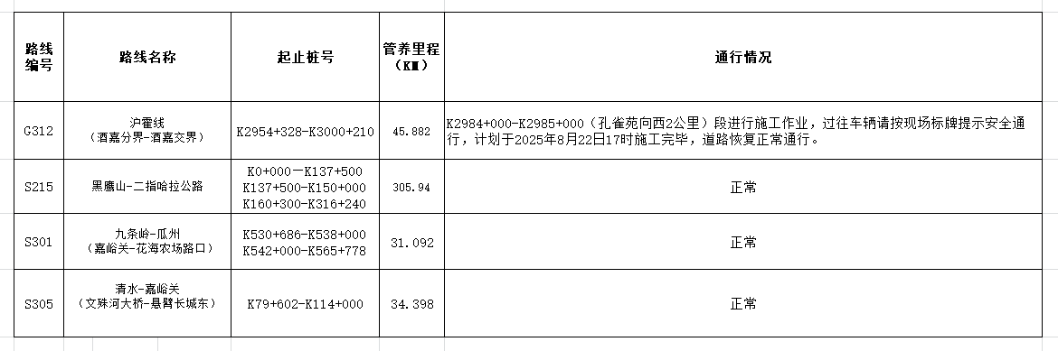 • 嘉峪關公路事業發展中心管養公路路況信息(2025年8月21日)