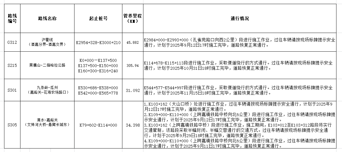 • 嘉峪關公路事業發展中心管養公路路況信息(2025年9月12日)
