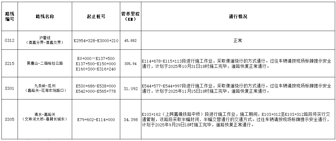 • 嘉峪關(guān)公路事業(yè)發(fā)展中心管養(yǎng)公路路況信息(2025年9月12日)