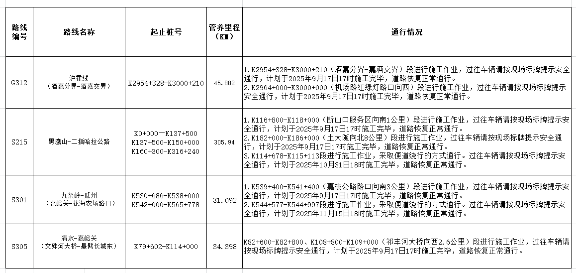 嘉峪關(guān)公路事業(yè)發(fā)展中心管養(yǎng)公路路況信息(2025年9月17日)